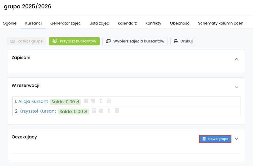 Za pomocą przycisku „Nowa grupa” możesz utworzyć grupę dla oczekujących kursantów – po kliknięciu w przycisk tworzy się grupa z dopiskiem „nowa” o takich samych parametrach, a kursanci, którzy byli w liście oczekujących, automatycznie zostają przeniesieni do nowej grupy na listę rezerwacji.