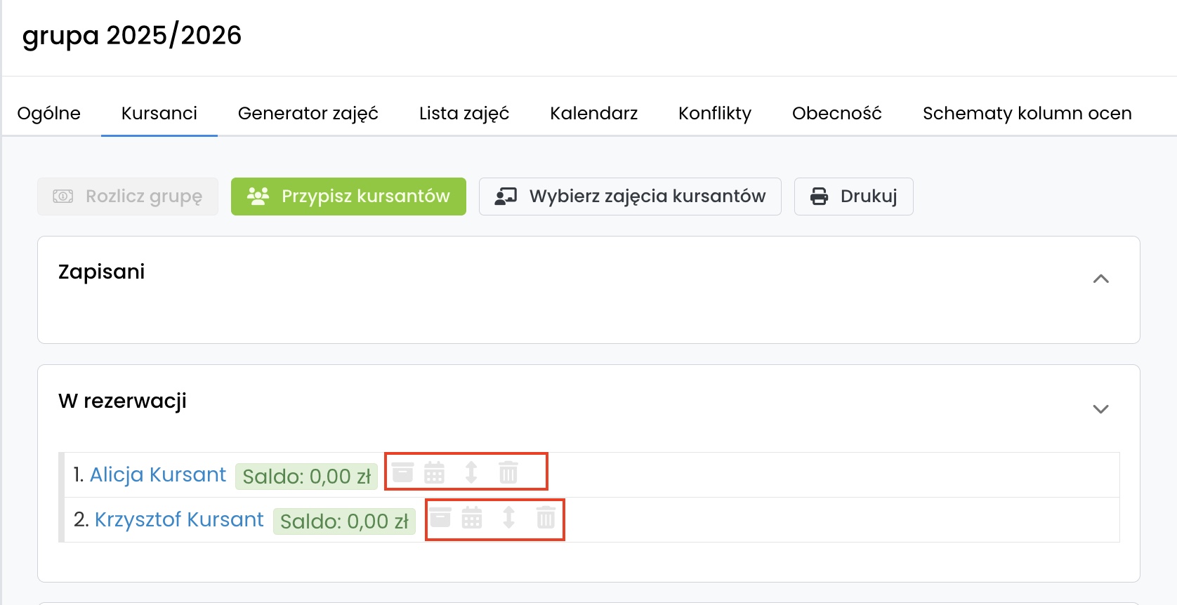 Przy każdym kursancie dostępne są trzy ikony.