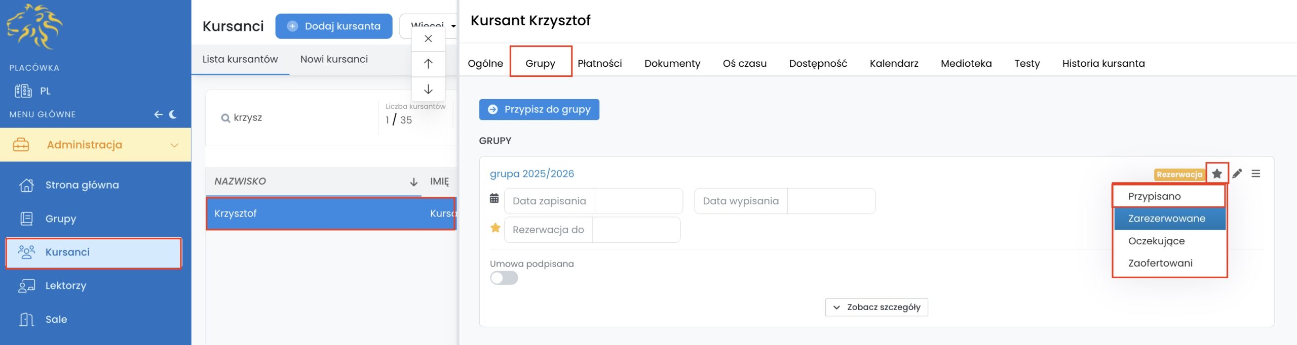 - W rezerwacji (kursanci dodani do grupy, ale nie podpisali jeszcze umowy dot. tej grupy – nie wyświetlają się na liście obecności w grupie)