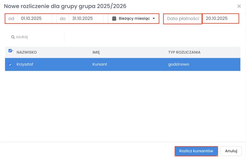 Po wprowadzeniu zmian kliknij w przycisk „Rozlicz kursantów”.