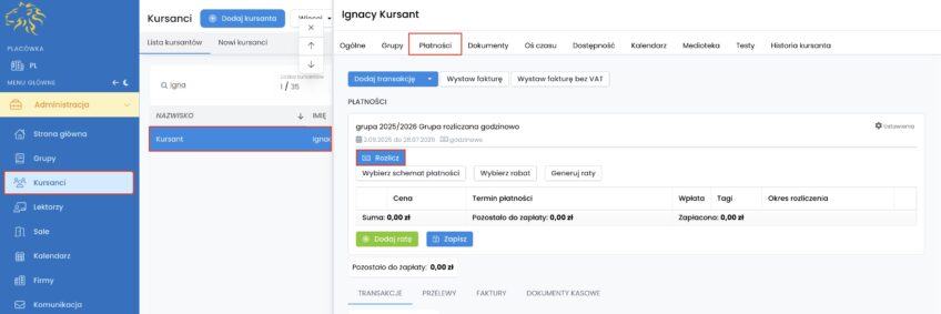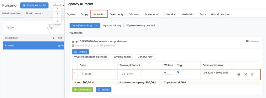 Rozliczenie pojawi się u każdego kursanta w zakładce „Kursanci” -> „Płatności”.
