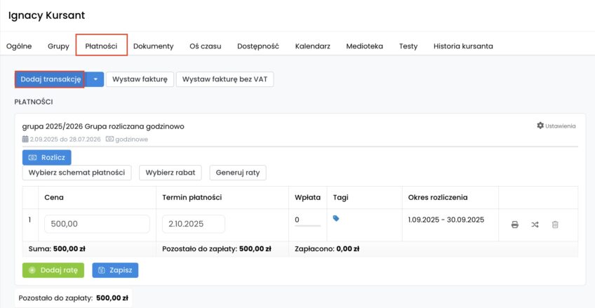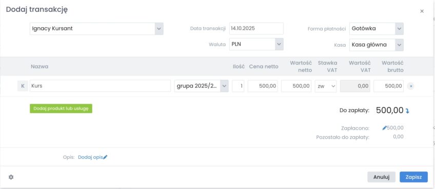 1. Wystarczy, że w zakładce „Płatności” u wybranego kursanta klikniesz w opcję „Dodaj transakcję”.