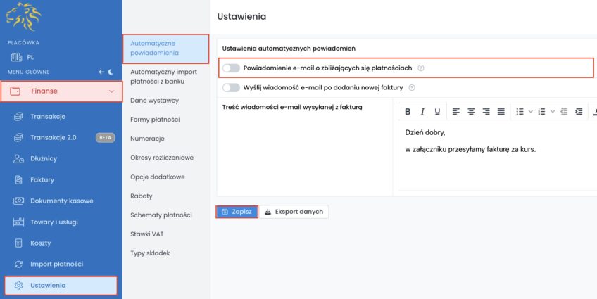 Jeśli korzystasz z modułu „Finanse”, możesz skorzystać z opcji automatycznej wysyłki powiadomień do kursantów o zbliżającym się terminie płatności.