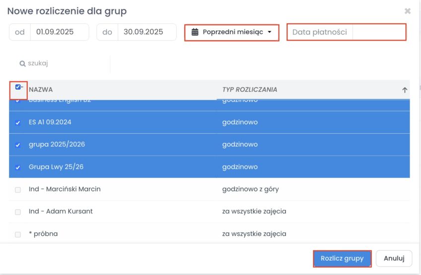 1. Rozliczając jednocześnie wszystkich kursantów ze wszystkich/wybranych grup rozliczanych godzinowo
