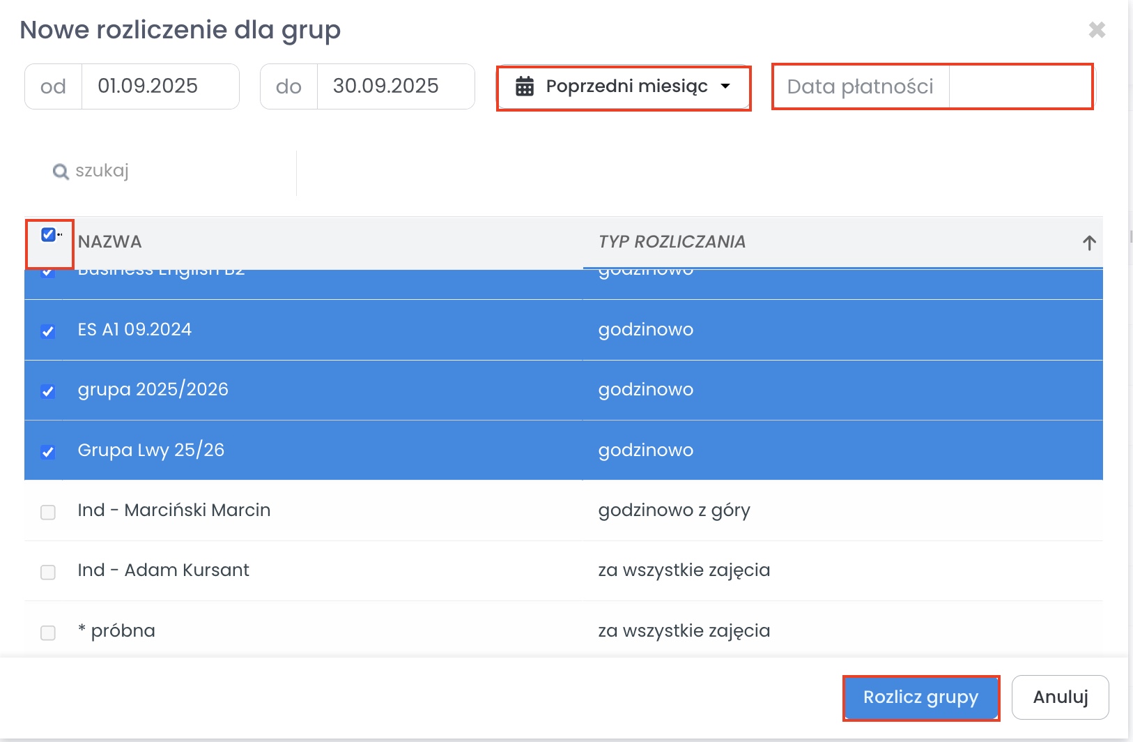 Jednoczesne rozliczenie wszystkich kursantów ze wszystkich/wybranych grup
