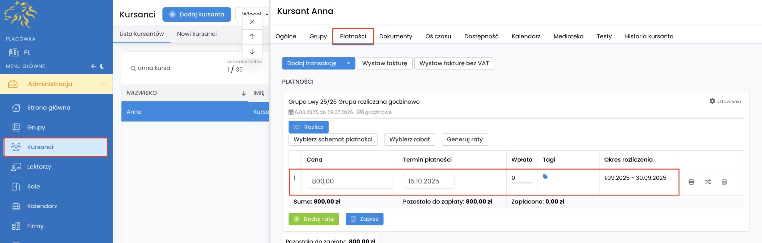 Rozliczenie pojawi się u każdego kursanta w zakładce „Kursanci” -> „Płatności”.