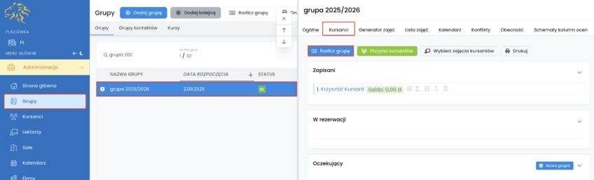 2. Wybierz grupę (rozliczaną godzinowo) i wejdź w zakładkę „Kursanci”.