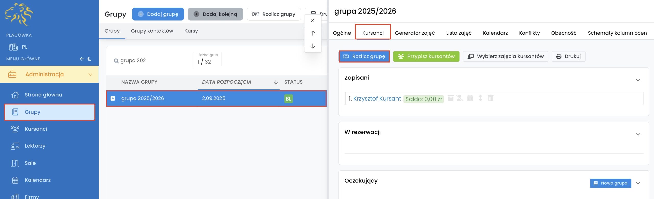 Po wprowadzeniu zmian kliknij w przycisk „Rozlicz kursantów”.
