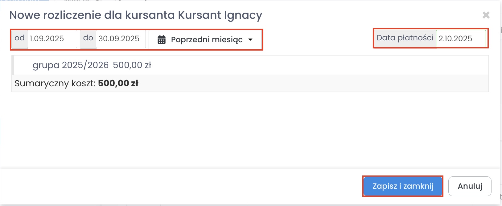 4. Wybierz zakres czasu, za jaki chcesz rozliczyć kursantów i wprowadź termin płatności, do którego powinni dokonać zapłaty