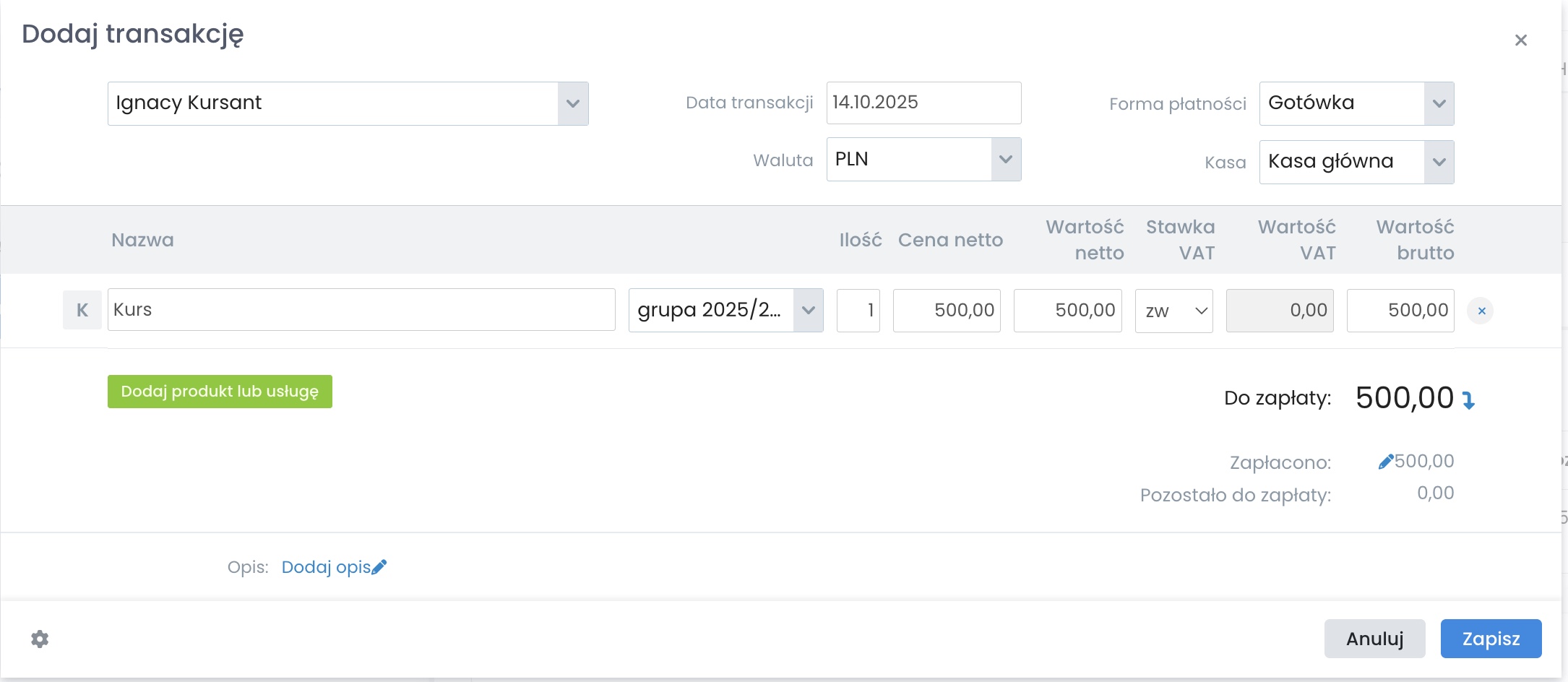 1. Wystarczy, że w zakładce „Płatności” u wybranego kursanta klikniesz w opcję „Dodaj transakcję”.
