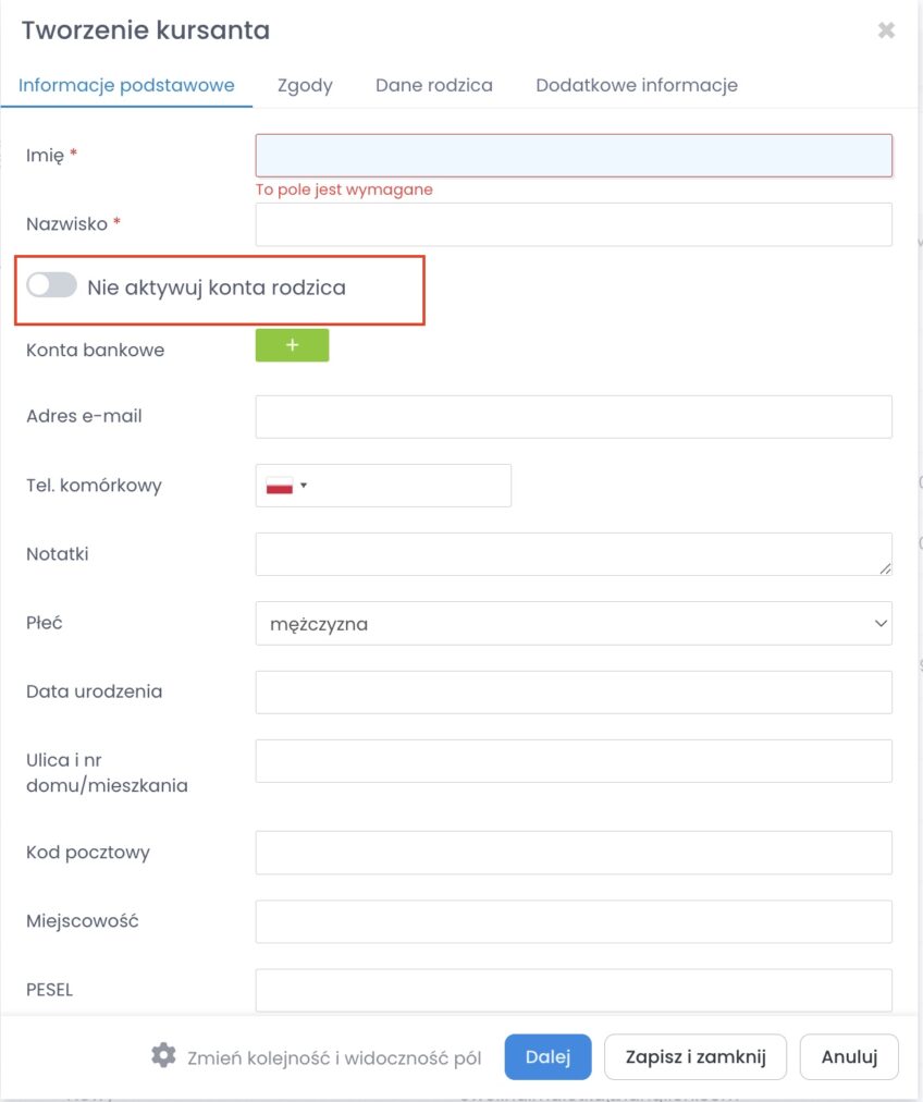 Jeżeli zdarzy się sytuacja, że kursant jest dorosły i nie wymaga tworzenia konta rodzica, możesz w prosty sposób wyłączyć konto rodzica dla tego kursanta. Aby tego dokonać, wejdź w edycję kursanta i w formularzu edycji kliknij w opcję „Nie aktywuj konta rodzica”.