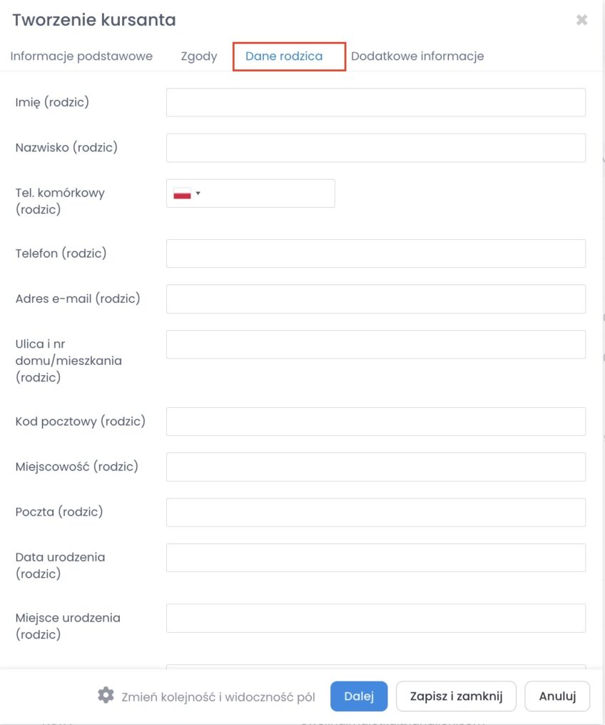 Przy dodawania małoletniego kursanta do Platformy LangLion, automatycznie utworzone zostanie konto rodzica wraz z loginem i hasłem. W edycji kursanta wyświetlona zostanie także dodatkowa zakładka przeznaczona na dane rodzica.