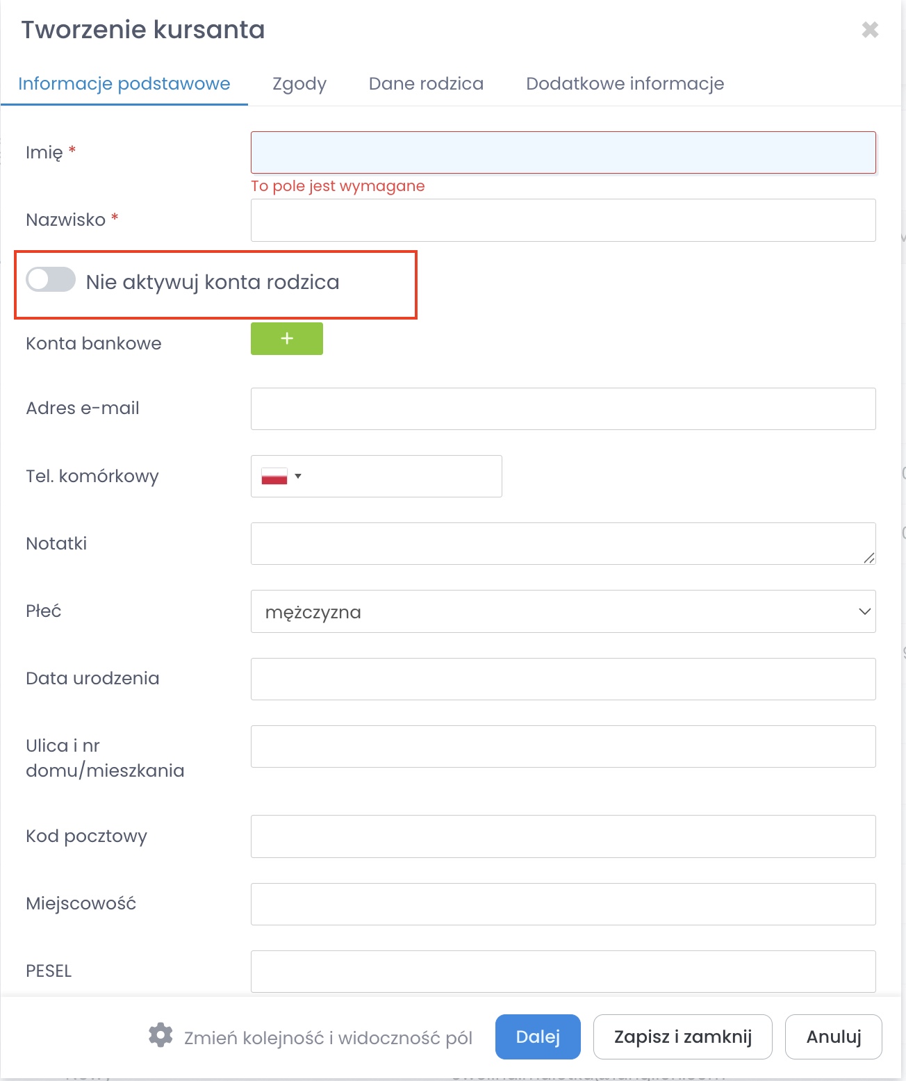 Jeżeli zdarzy się sytuacja, że kursant jest dorosły i nie wymaga tworzenia konta rodzica, możesz w prosty sposób wyłączyć konto rodzica dla tego kursanta. Aby tego dokonać, wejdź w edycję kursanta i w formularzu edycji kliknij w opcję „Nie aktywuj konta rodzica”.