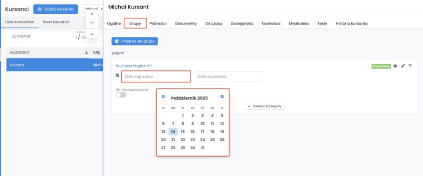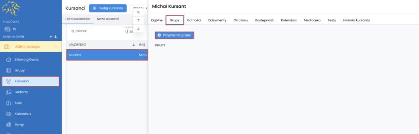 1. Przejdź do zakładki „Kursanci” i wybierz kursanta z listy. Teraz przejdź do zakładki „Grupy” po prawej stronie ekranu.
