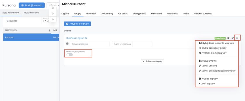 Z tego miejsca możesz również wypisać lub usunąć kursanta z grupy, dodać umowę czy zmienić datę jej podpisania, edytować dane kursanta w grupie, zmieniając np. typ rozliczania, wydrukować szczegóły grupy, czy przenieść kursanta do innej grupy.
