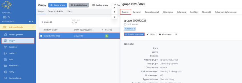 Wybierz odpowiednią pozycję z zakładki „Grupy” i kliknij w przycisk „Przypisz kursantów”, w zakładce „Ogólne” .