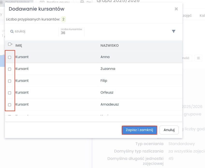 3. Z wyświetlonej listy grup wybierz właściwą i kliknij w przycisk „Zapisz i zamknij”. Możesz przypisać kursanta do kilku grup jednocześnie.