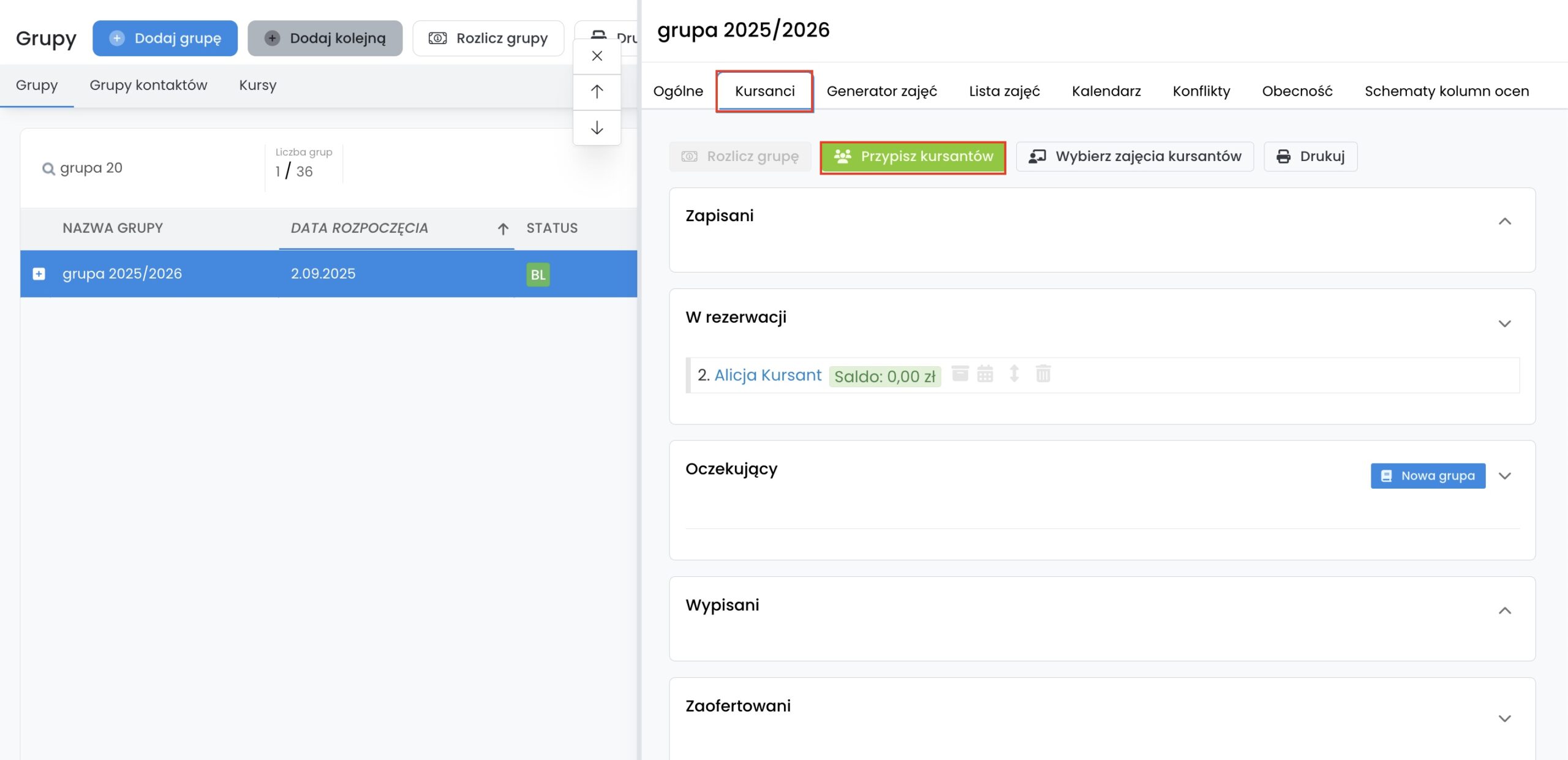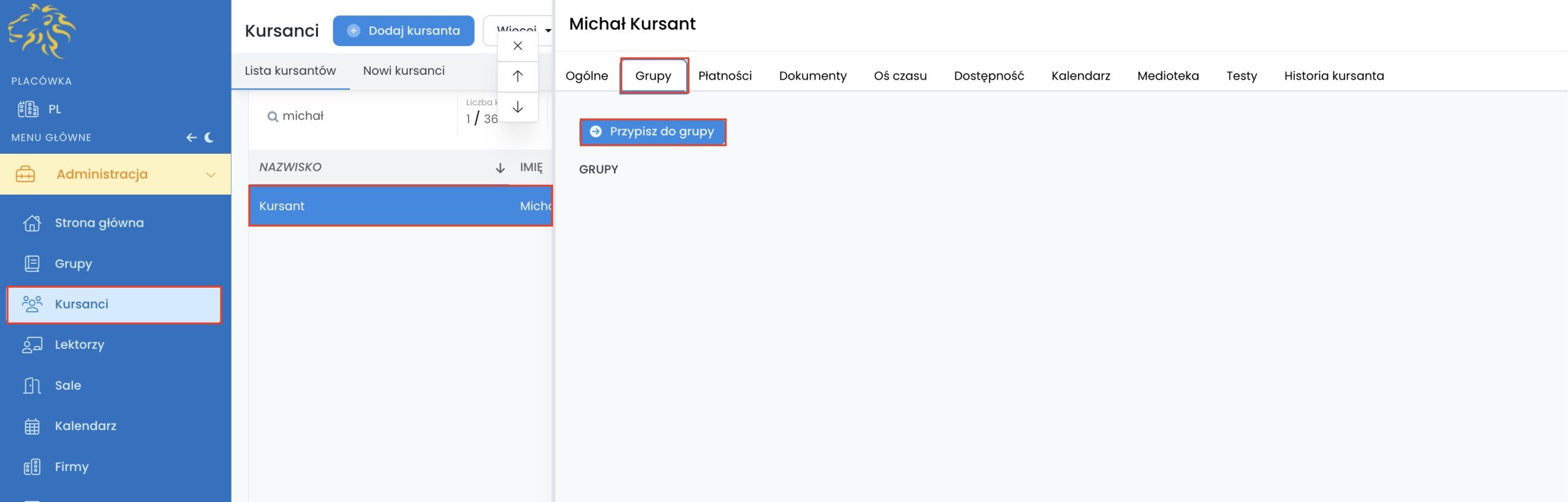 Trzeci sposób przypisania kursanta do grupy dostępny jest w zakładce „Kursanci”. Z poziomu tej zakładki, możesz także przypisać kursanta do grupy.