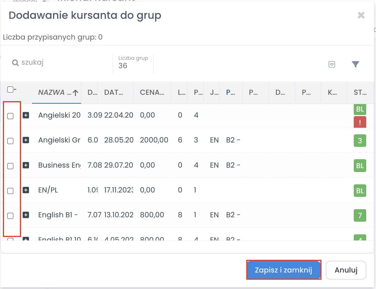 3. Z wyświetlonej listy grup wybierz właściwą i kliknij w przycisk „Zapisz i zamknij”. Możesz przypisać kursanta do kilku grup jednocześnie.