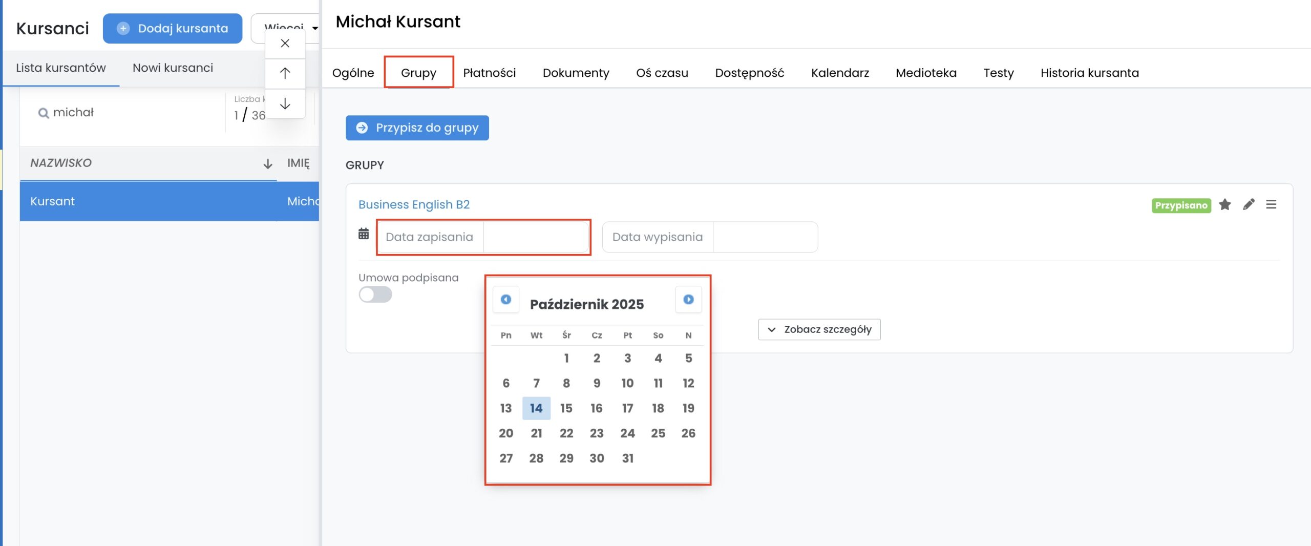 Podobnie jak w pierwszym sposobie, jeśli kursant dołączył do grupy w trakcie jej trwania, to konieczne jest wprowadzenie daty zapisania kursanta do grupy, poprzez edycję jego danych w grupie.