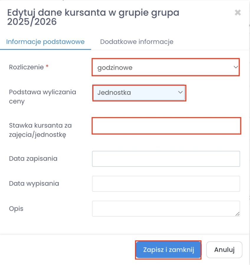 W przypadku, gdy edytujesz domyślny typ rozliczenia w grupie, to nie zmieni się on automatycznie u kursanta zapisanego do tej grupy. Po edycji danych w grupie, konieczne jest zmodyfikowanie ustawień płatności oddzielnie u każdego z kursantów do niej przypisanych.