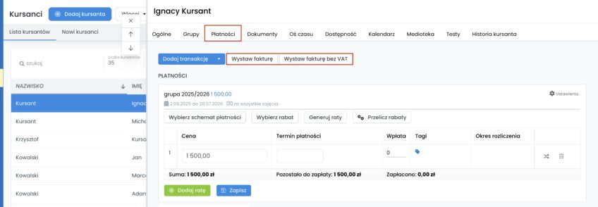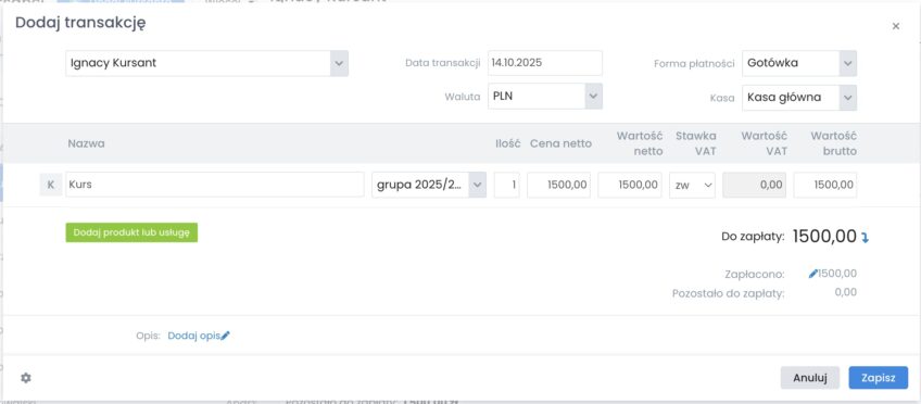 Gotowe, kursant został rozliczony i powstała transakcja, do której możesz wystawić fakturę.