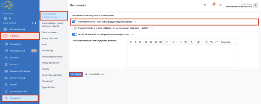 Aby włączyć taką funkcję wystarczy przejść do zakładki „Ustawienia” w module Finanse. Następnie należy przejść do automatycznych powiadomień „Powiadomienie e-mail o zbliżających się płatnościach”. Wprowadzone zmiany należy zapisać za pomocą przycisku „Zapisz”.