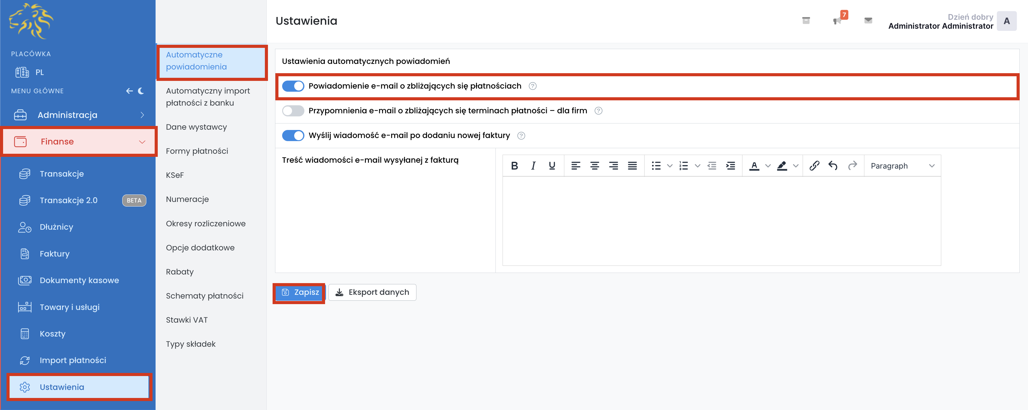 Aby włączyć taką funkcję wystarczy przejść do zakładki „Ustawienia” w module Finanse. Następnie należy przejść do automatycznych powiadomień i zaznaczyć „Powiadomienie e-mail o zbliżających się płatnościach”. Wprowadzone zmiany należy zapisać za pomocą przycisku „Zapisz”.