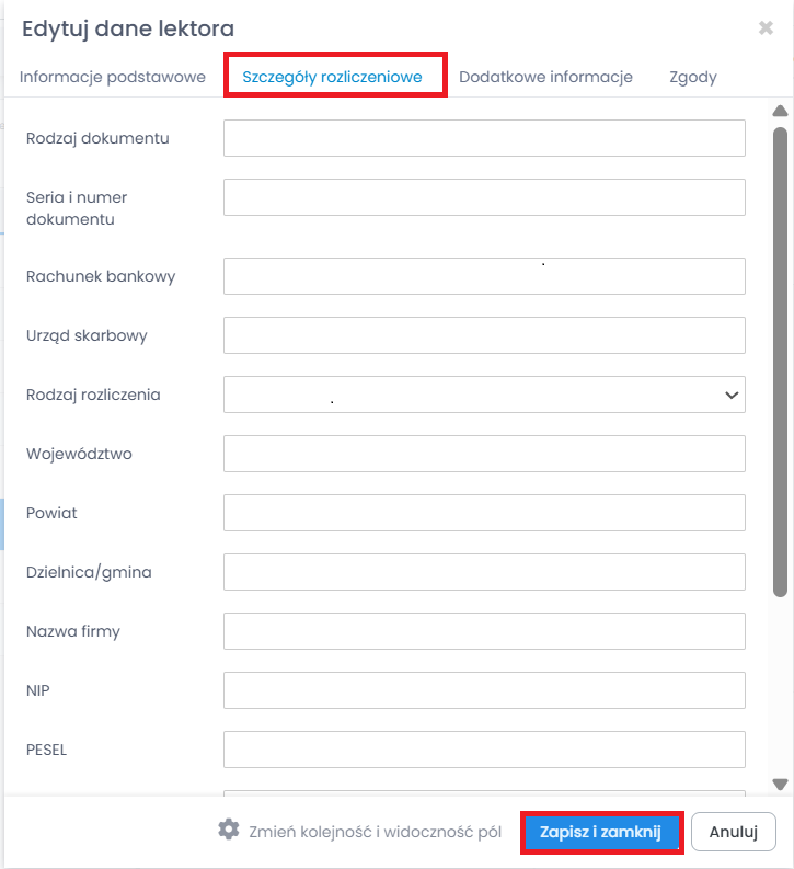 Dane rozliczeniowe lektora wykorzystywane są na etapie rozliczenia lektora ze szkołą, tworzenia jego wynagrodzenia.