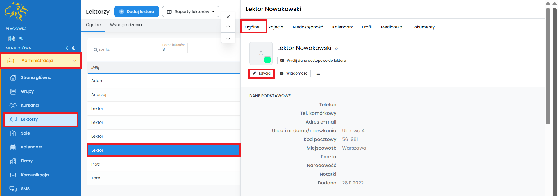 Jeśli nie uzupełniłeś ich podczas tworzenia konta nauczyciela do systemu, dodaj je poprzez edycję danych nauczyciela.
