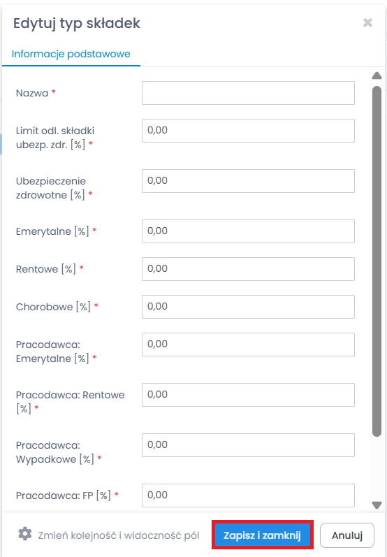 3. Następnie, w oknie edycji wysokości stawek, wprowadź nazwę, odpowiednie wartości i kliknij „Zapisz i zamknij”.