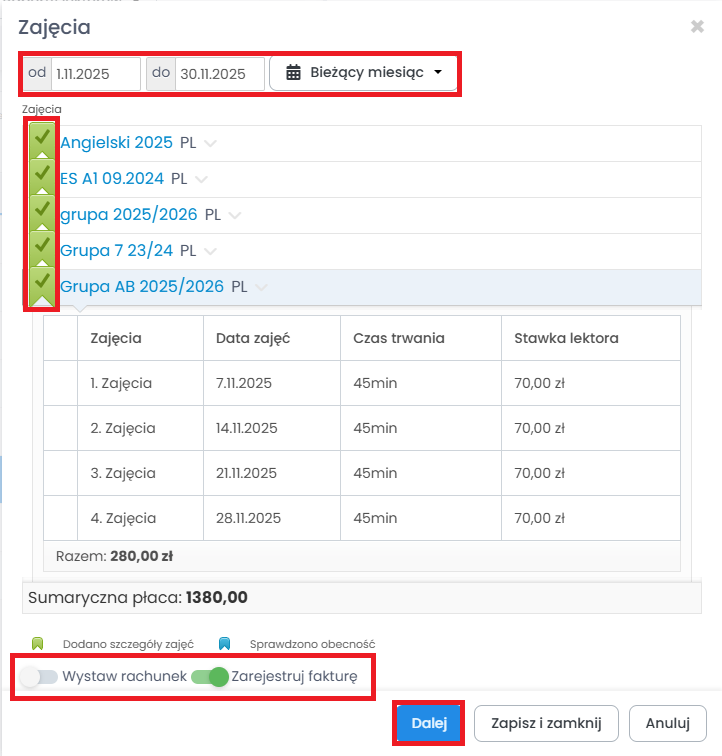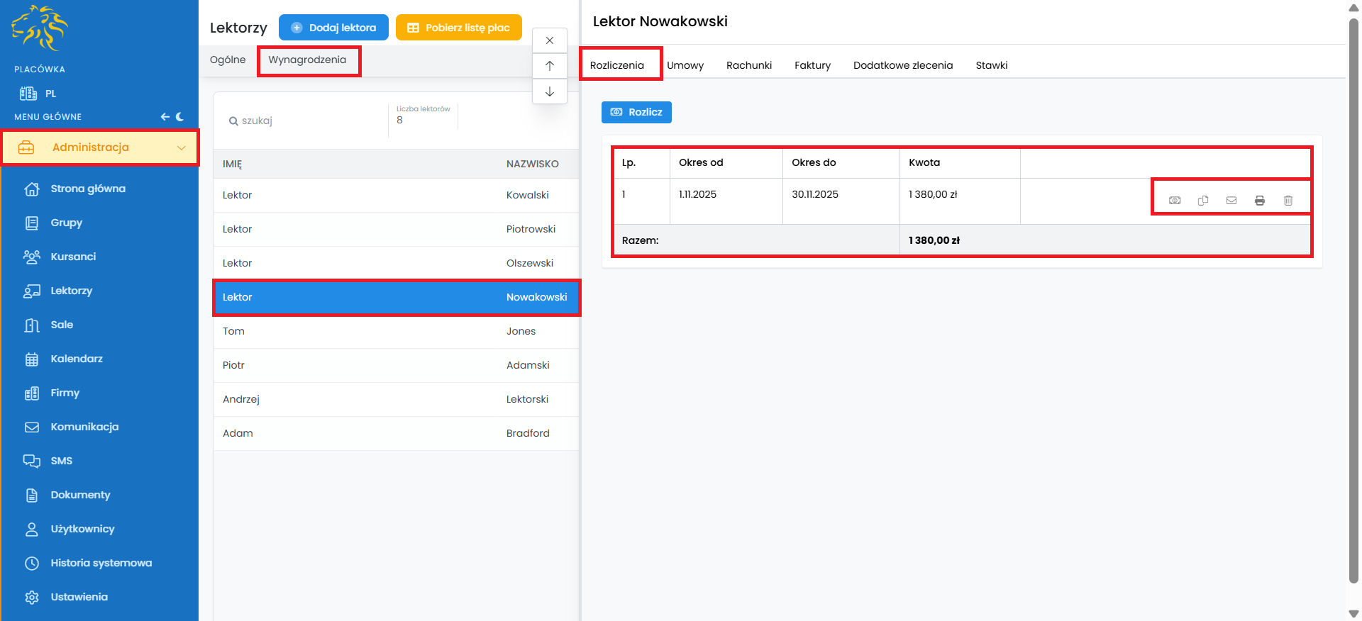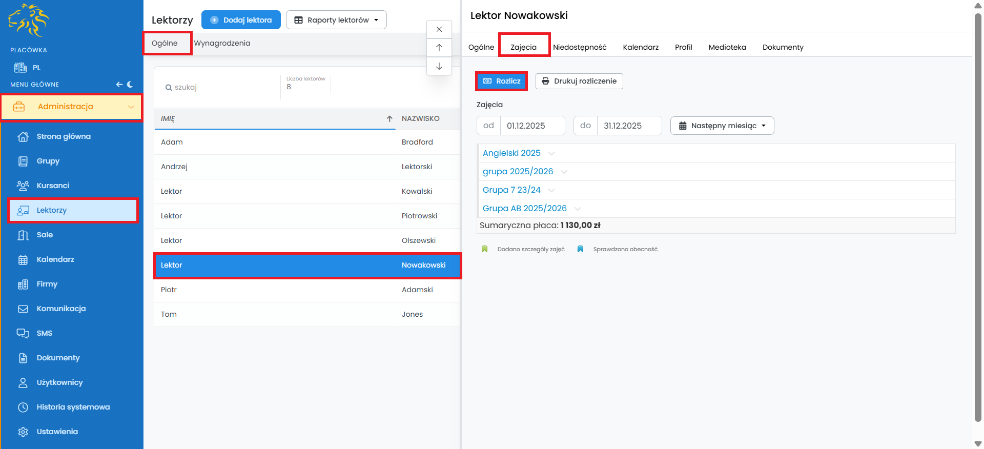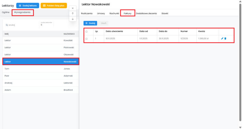 Gotowe, rozliczenie lektora zostało sporządzone i jest dostępne w zakładce „Lektorzy” -> „Wynagrodzenia” -> „Rozliczenia”.