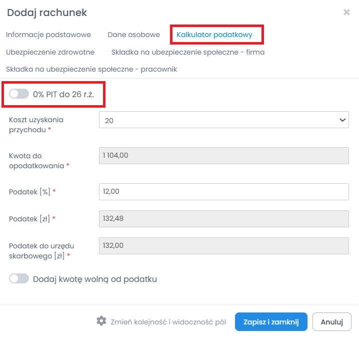 Ważne! Opcja „0% PIT do 26 r.ż.” zaznacza się automatycznie, gdy system widzi, że lektor nie ma ukończonego 26 roku życia. To ważne abyś wprowadzał daty urodzenia lektora w ich danych osobowych, tak aby mieć pewność, że system rozpozna czy dana osoba powinna mieć naliczany odpowiedni podatek. Jeśli nie uzupełniasz takich danych musisz pamiętać, aby manualnie zaznaczyć tę opcję podczas wystawiania rachunku.