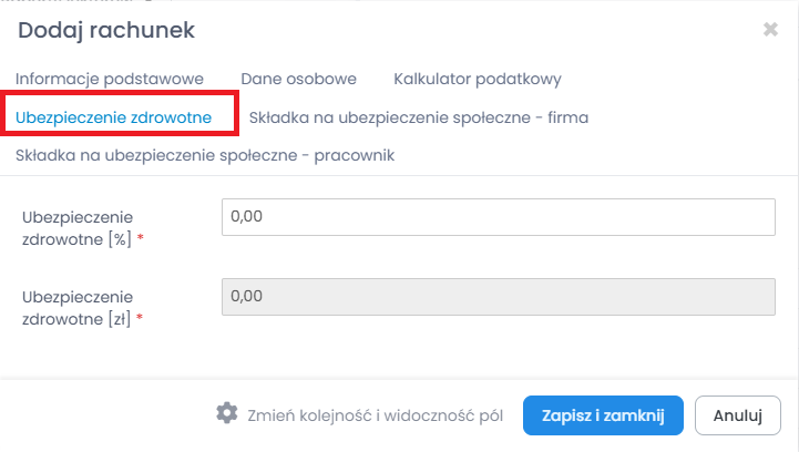 „Ubezpieczenia zdrowotne” – zakładka przedstawiająca zestawienie składek odprowadzanych na ubezpieczenia zdrowotne. W zakładce tej, możesz edytować procent składki na ubezpieczenia zdrowotne.