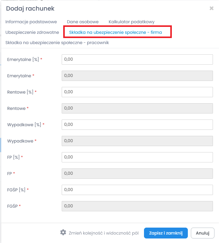 Kolejna zakładka „Składka na ubezpieczenia społeczne firma” przedstawia koszty pracodawcy, jakie ponosi z tytułu zatrudnienia lektora. W zakładce tej także możesz edytować wartości procentowe poszczególnych składek.