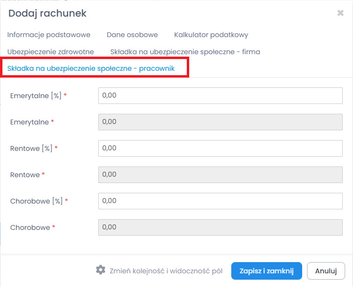 Zakładka „Składka na ubezpieczenia społeczne pracownik” zawiera informacje dotyczące wysokości składek, które potrącane są z pensji pracownika na rzez ubezpieczeń społecznych. Wysokości składek także są edytowalne.