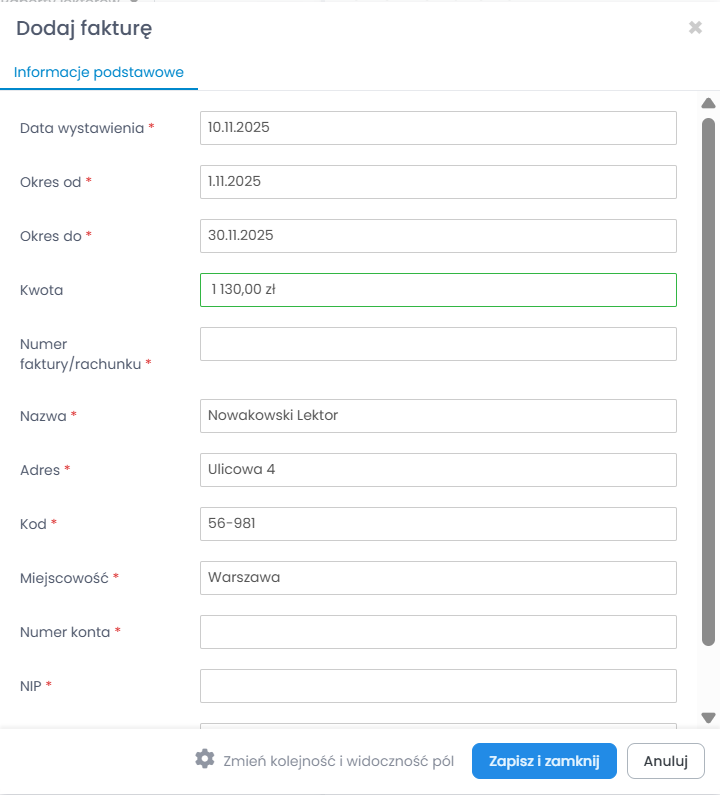 6. W następnym oknie, system uzupełnił automatycznie dane dotyczące okresu rozliczenia, kwoty oraz danych lektora. Wypełnij pozostałe wymagane pola.