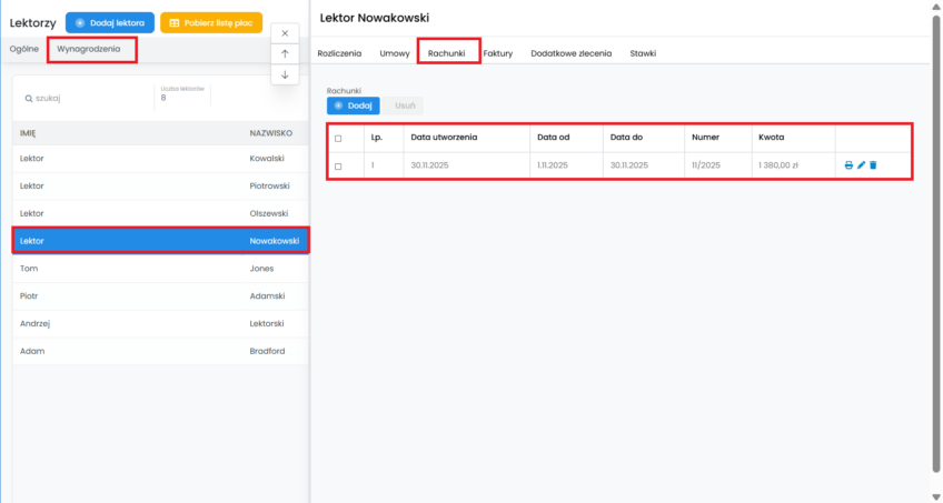 Z tego poziomu możesz wystawić do niego rachunek, fakturę, wysłać je do lektora drogą mailową, wydrukować, bądź w przypadku błędnego wystawienia, usunąć je.