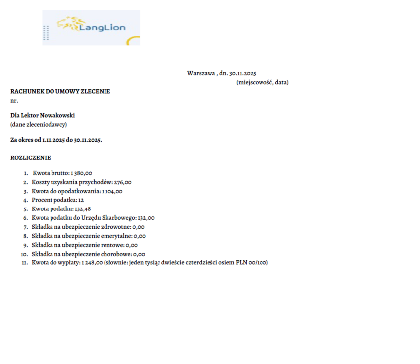 Przykładowy rachunek lektora poniżej.