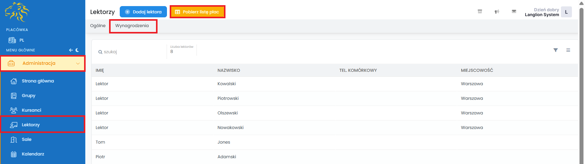 Możesz tego dokonać w prosty sposób i wystarczy, że wejdziesz w zakładkę „Lektorzy”, dalej „Wynagrodzenia” i klikniesz w przycisk „Pobierz listę płac”.