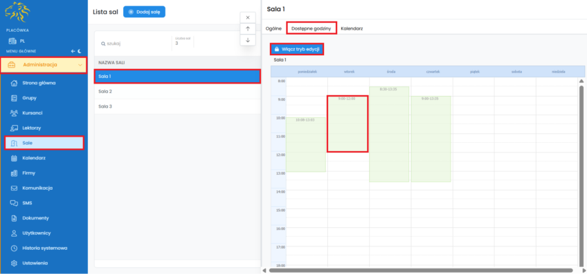 1. Z modułu „Administracja” wybierz zakładkę „Sale” i zaznacz odpowiednią pozycję.
