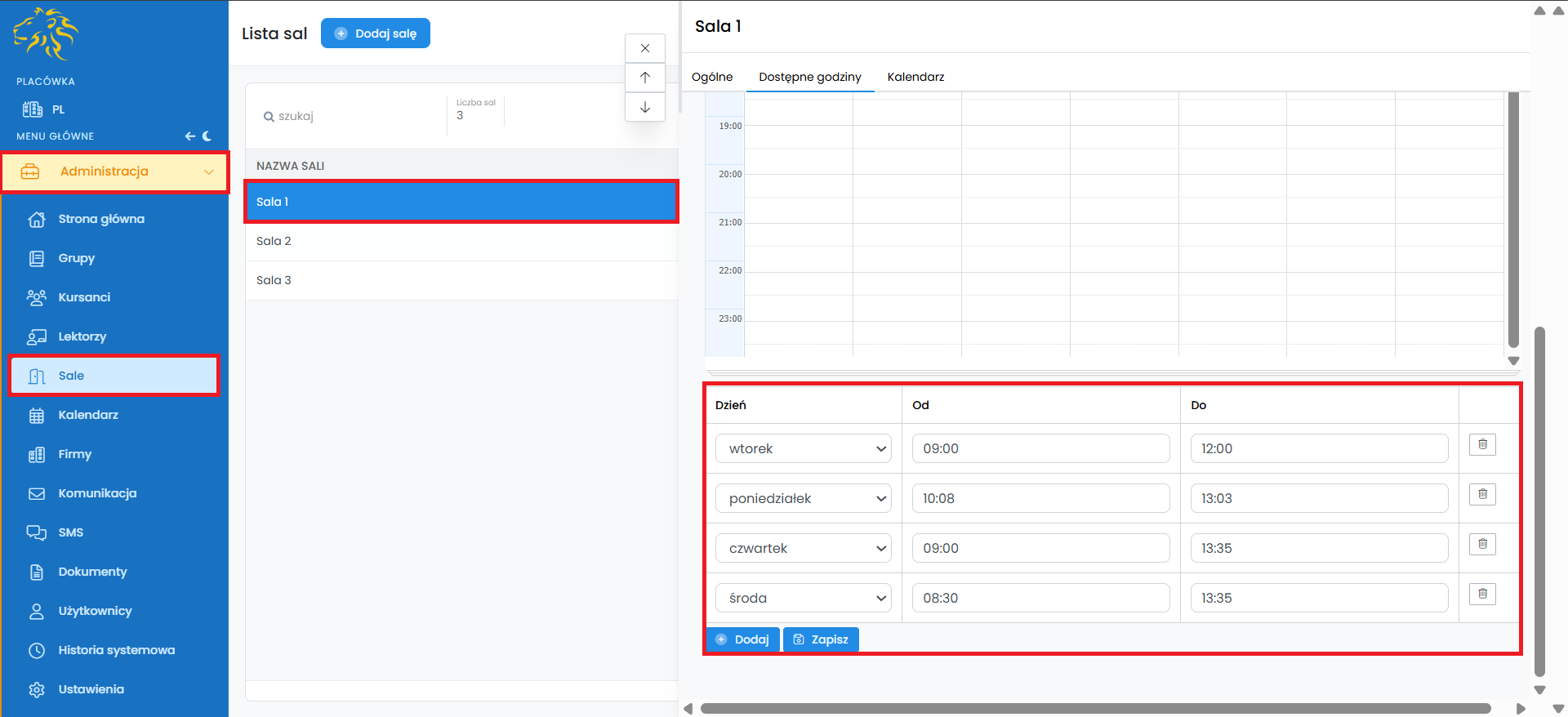 1. Z modułu „Administracja” wybierz zakładkę „Sale” i zaznacz odpowiednią pozycję.