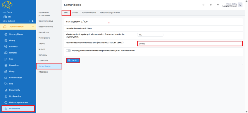 - W pole „Nazwa nadawcy” wprowadź nazwę szkoły i zapisz zmiany.