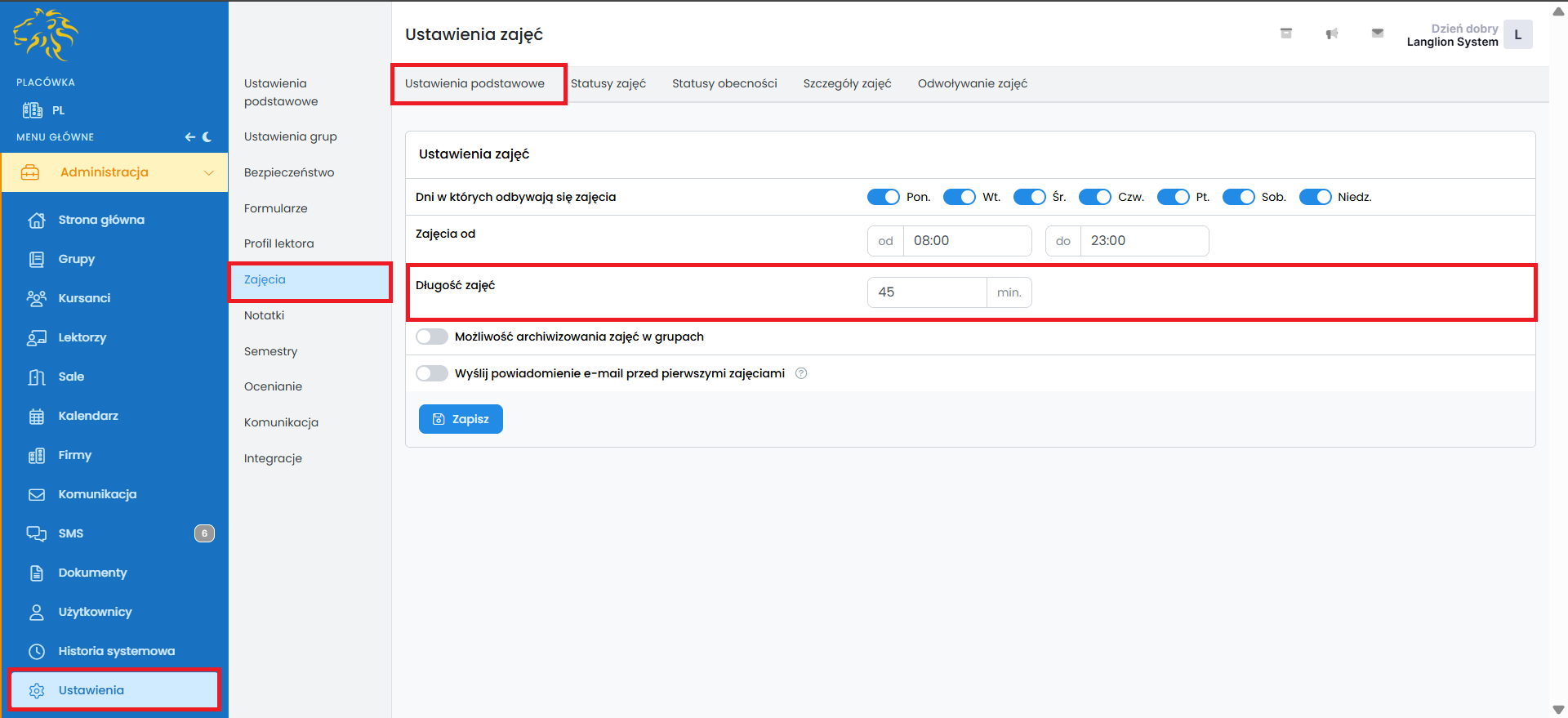 - Przejdź do modułu „Administracja” a następnie wybierz zakładkę „Zajęcia” i „Ustawienia podstawowe”