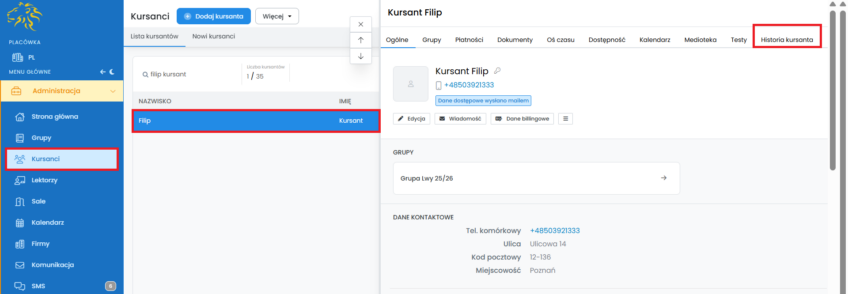 1. Wybierz zakładkę „Kursanci” z menu „Administracja”.