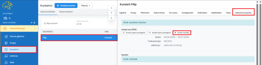 Notatki są elementem historii kursanta, którą możesz wydrukować. Jeżeli chcesz, aby na wydruku historii kursanta pojawiła się notatka, zaznacz atrybut „Widoczna na opinii opisowej” w edycji notatki.