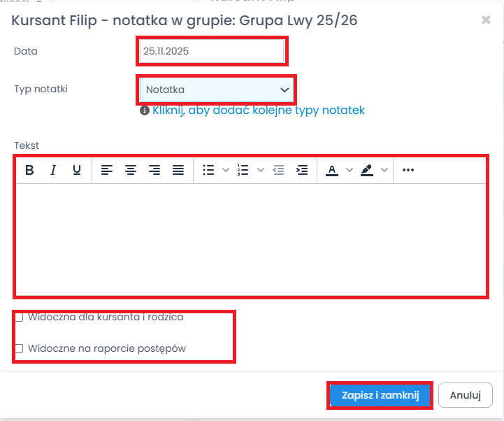 5. W oknie edycji notatki wpisz jej datę, wybierz typ oraz wpisz treść. Dodatkowo możesz zaznaczyć atrybuty związane z widocznością notatki – „widoczna dla kursanta” i „widoczna na opinii opisowej”.
