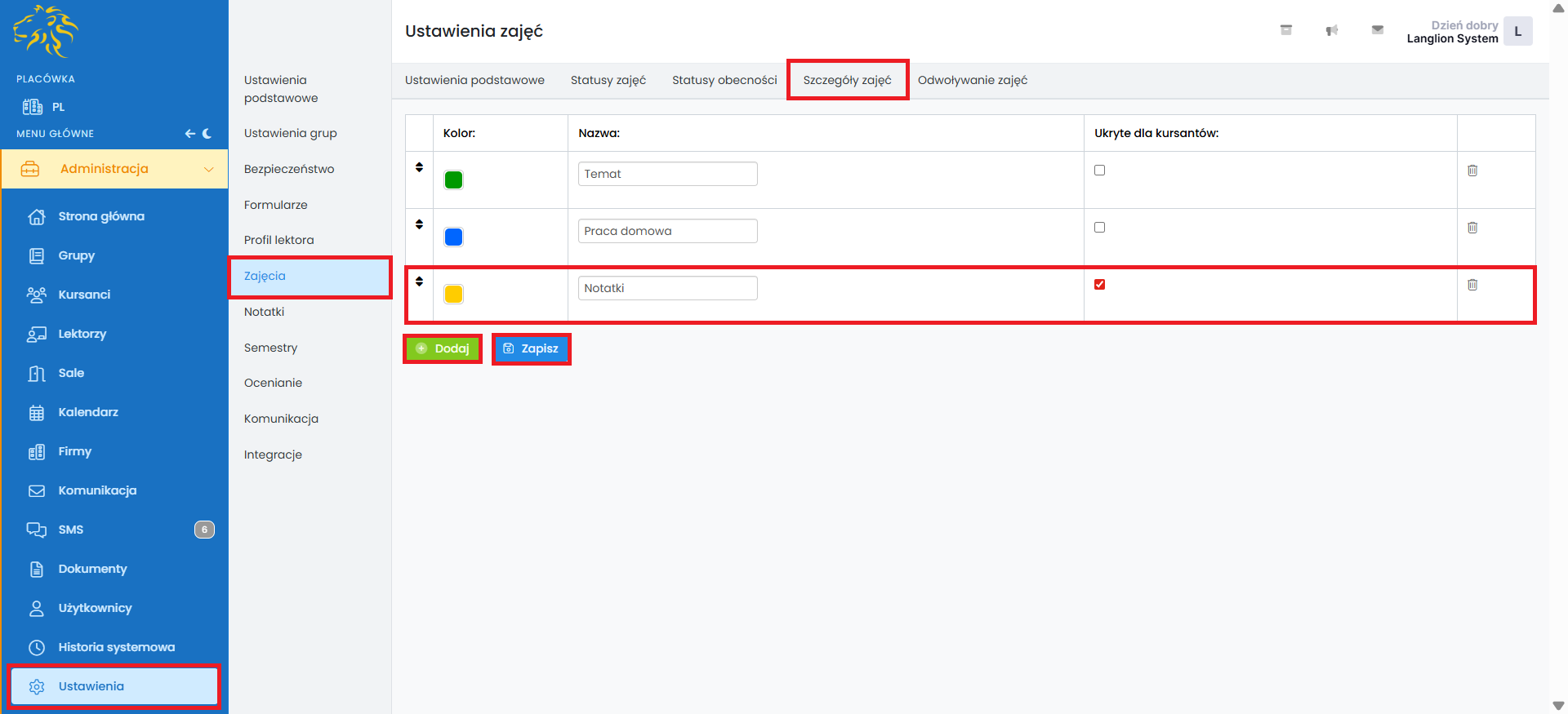 3. Wprowadź nazwę pola, w które wpisywane będą szczegóły zajęć. Możesz przypisać mu kolor a także wybrać czy ma być ono ukryte dla kursantów. Pole możesz zawsze usunąć, ale pamiętaj, że jeśli lektorzy wypełniali już je w dzienniku to te dane też zostaną usunięte.