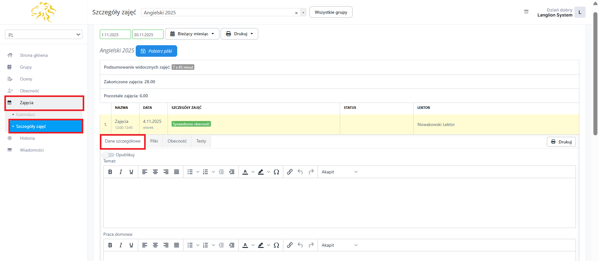 3. Kliknij w odpowiednie zajęcia na liście i w polach, które zostały już utworzone, wprowadź informacje i zapisz zmiany.