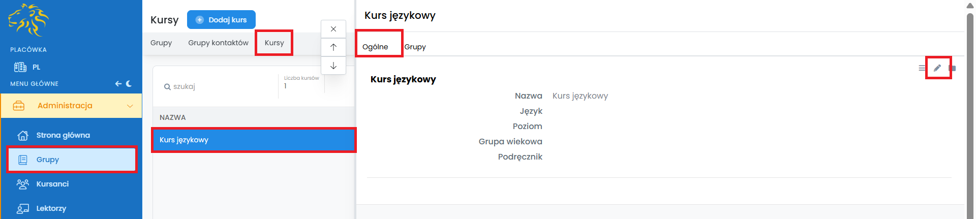 1. Z modułu „Administracja” wybierz zakładkę „Grupy” i następnie „Kursy”.